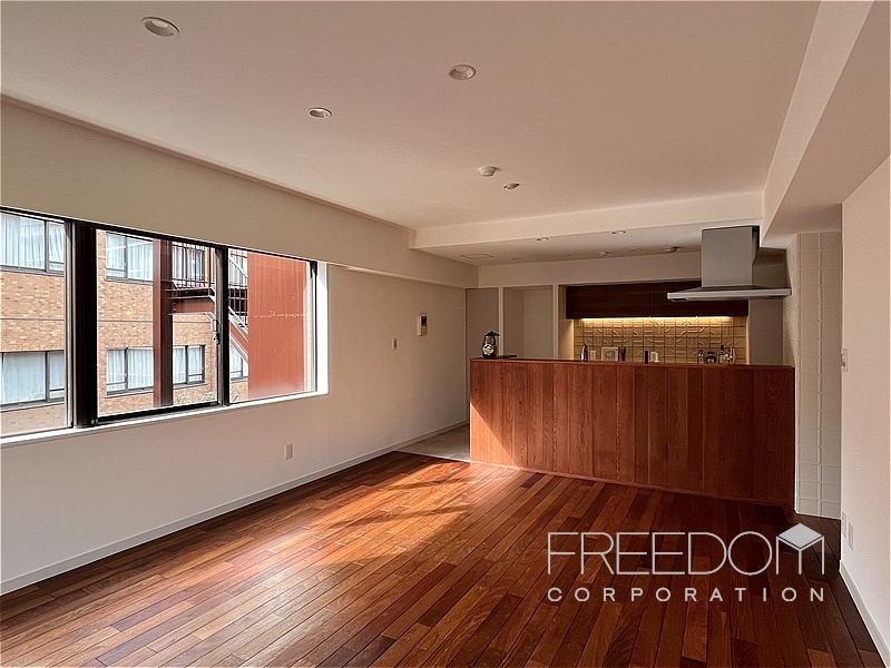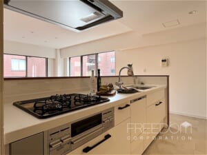 LDKは約18.5帖。南向きのバルコニーに面した掃き出し窓と西側の腰窓、二面から光が入り込む採光豊かな空間です。