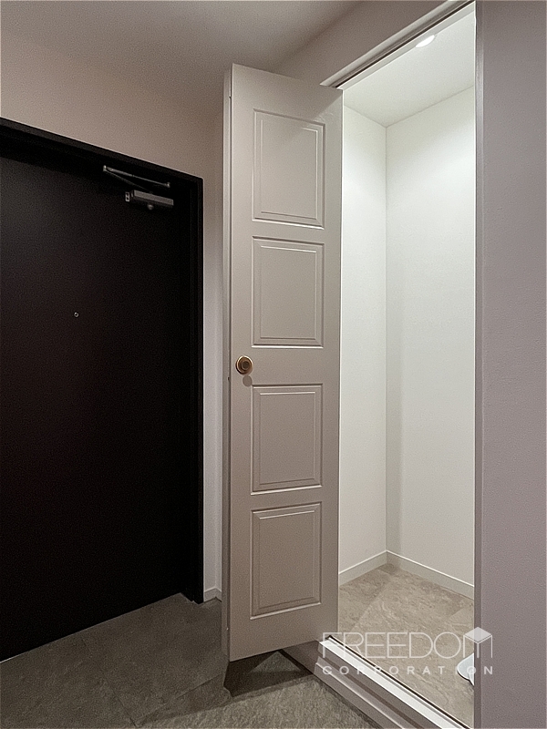 玄関ホールも贅沢な広さで、洋室とデザインを揃えたシャビーなクローゼットが備わっています。あえてシューズボックスを設けない潔い設計ですが、クローゼットに十分な奥行きがあるため、シューズインクローゼットのように工夫して使えそうです。