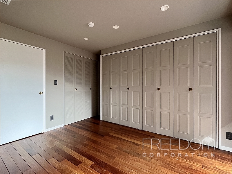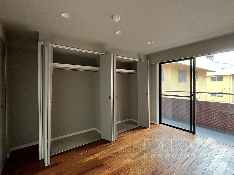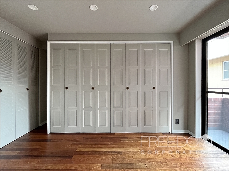 奥の洋室は約9.6帖。主寝室としてゆとりのある広さで、南向きの掃き出し窓から明るい光が差し込みます。壁一面には複数のクローゼットを備えており、手持ちの衣類をまとめて収められる頼もしい収納力です。
