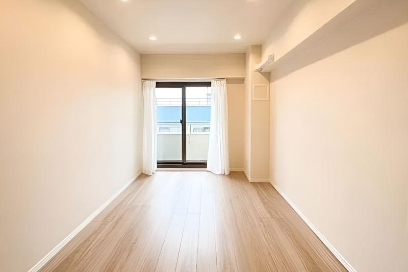 洋室は約5.2帖。リビングよりも野沢通りに近いお部屋ですが、西向きの窓とバルコニーがあり、採光・通風ともに良好です。ウォークインクローゼットには可動棚とL字型のハンガーパイプが備わっており、頼もしい収納力です。