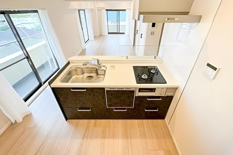 開放感あふれる対面式キッチン。窓辺の光がしっかり届いて爽やかです。コンロは2口ながら、浄水器付き水栓や食洗機を備え、効率的な調理が可能。スペースにゆとりがあるため、冷蔵庫の横にキッチンカウンターなどを並べて置くこともできそうです。